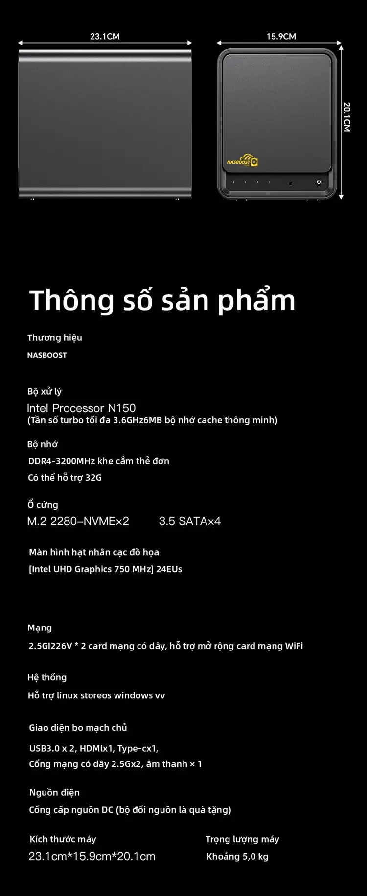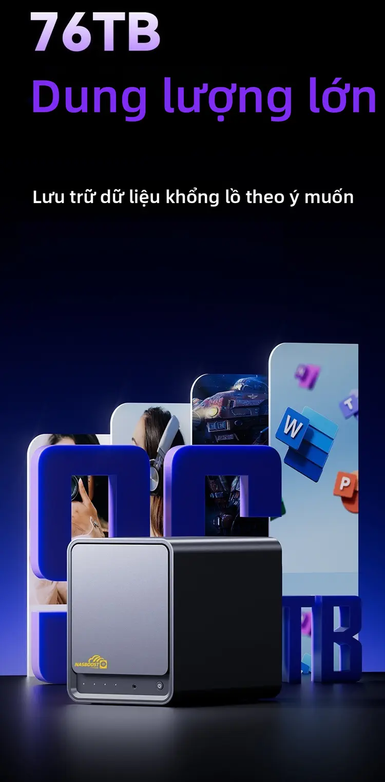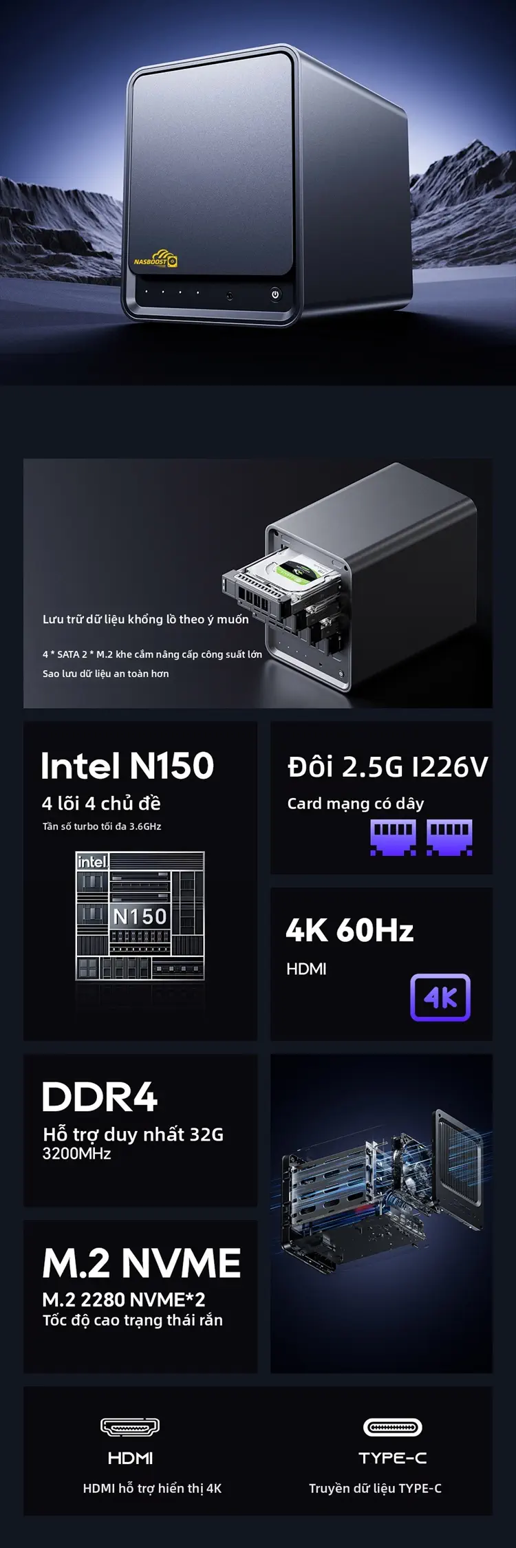 NasBoost N41 được trang bị bộ vi xử lý Intel N150 thế hệ thứ 12 với xung nhịp turbo tối đa 3,4 GHz; bốn ổ cứng 3,5 inch và hai khe cắm M.2 NVMe. Thiết bị cũng được trang bị hai card mạng có dây I1226V 2.5G và ổ đĩa eMMC 64G tích hợp, biến nó thành một sản phẩm thiết yếu cho những người đam mê NAS muốn nâng cấp.